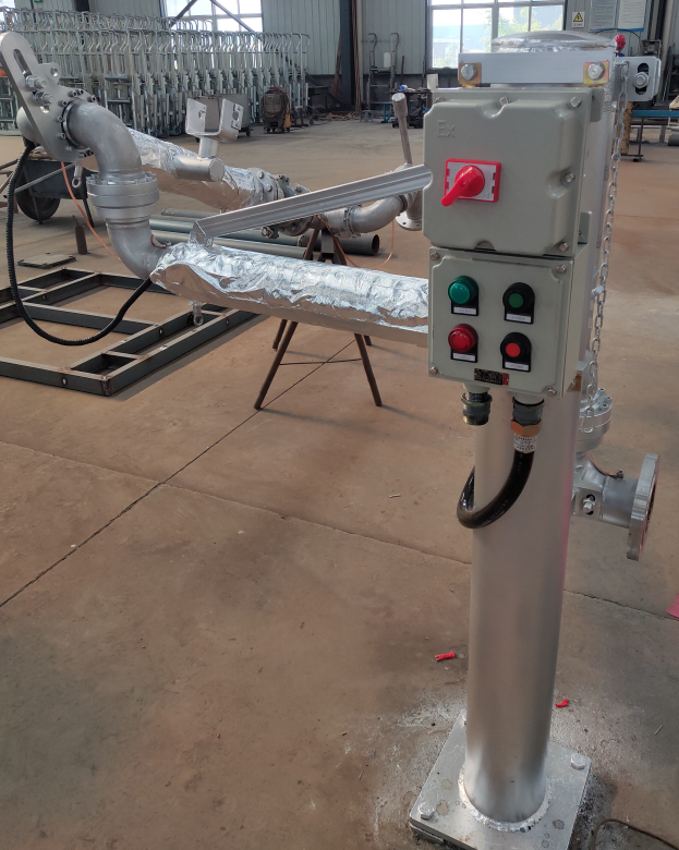 根據(jù)業(yè)主要求,乙二胺需在定溫60℃下方可進(jìn)行裝卸作業(yè)。我公司電氣專業(yè)工程師成功設(shè)計(jì)出電溫控設(shè)施,可在鶴管管線加熱至60℃后經(jīng)熱傳感器信號(hào)輸出后停止加熱,在鶴管管線溫度低于60℃自動(dòng)重啟加熱設(shè)備。該設(shè)備操作簡單,安全穩(wěn)定性高,一次性設(shè)定即可,能有效防范因操作不當(dāng)造成裝卸不暢及設(shè)備使用壽命短的問題。